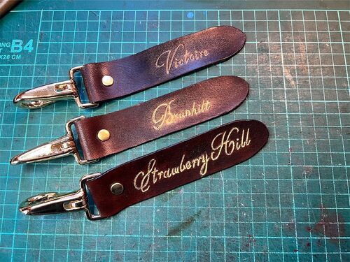 馬の頭絡に付けるネームプレート製作の依頼を受けて… 3㎜厚の牛革を用意して… サイズとカラーのご希望を聞き、製作開始! 型紙作って、革を裁断✂️ あとは、ご希望に合う金具と塗料をネットとオカダヤで調達。 これは、オランダ製のゴールドの塗料。 カットし…